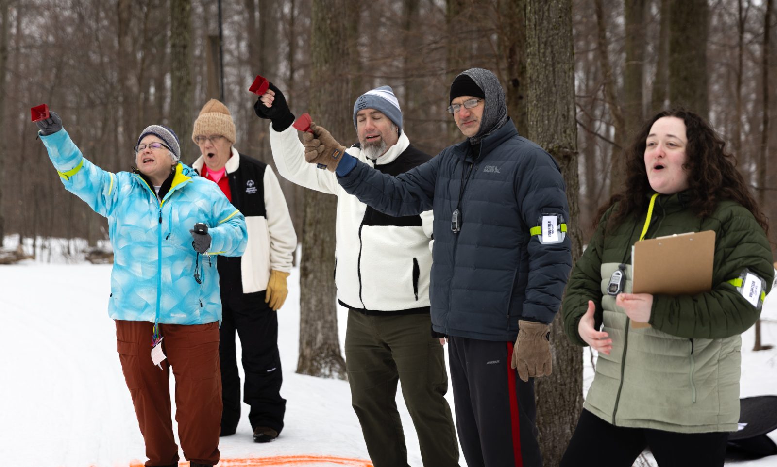 A volunteer keeps time during cross-country skiing competition at Bristol Mountain Nordic Center in Canandaigua, N.Y. on Feb. 21, 2026. (Photo by Benjamin Lambrecht)