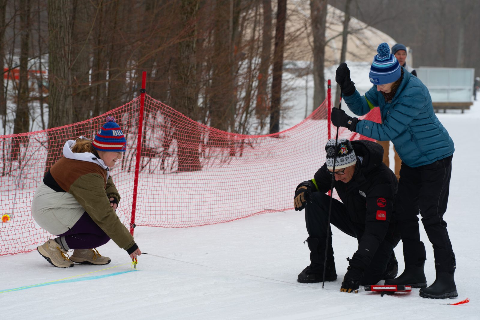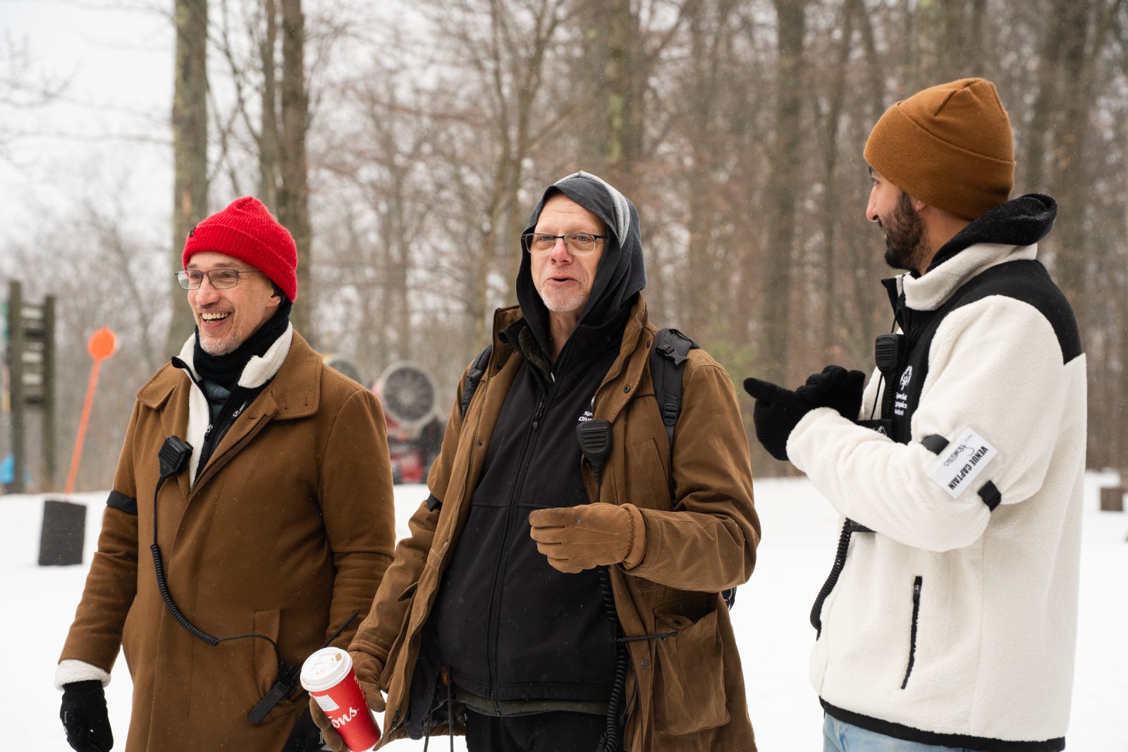 Venue Captains Joel Peterson, Harry King, and Francisco Alvidrez are instructing volunteers during the cross country skiing competition at Bristol Mountain Nordic Center. (Photo by Caleb Bennett)
