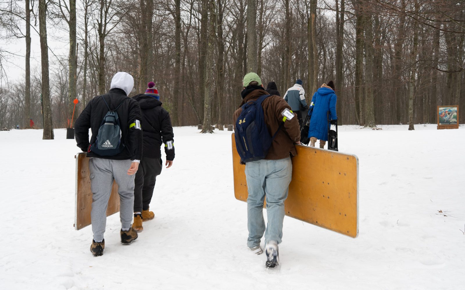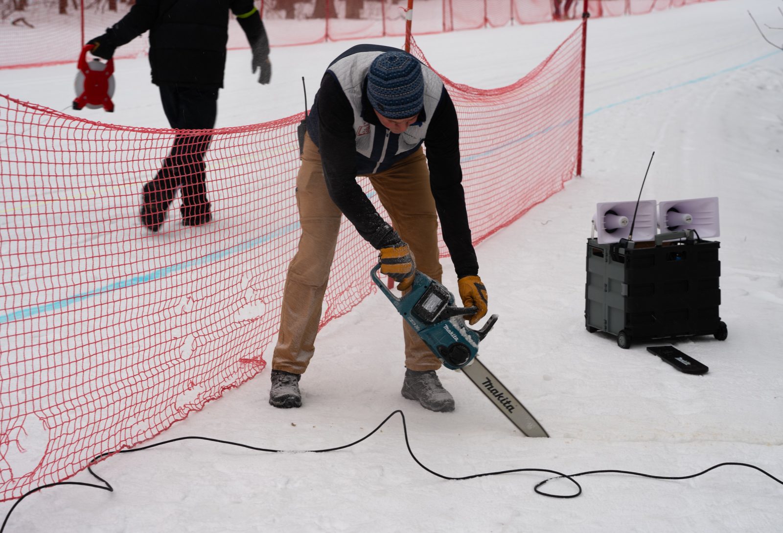 Cross-country skiing volunteer Collin Graf transports a table during cross-country skiing competition at Bristol Mountain Nordic Center in Canandaigua, N.Y. (Photo by Caleb Bennett)