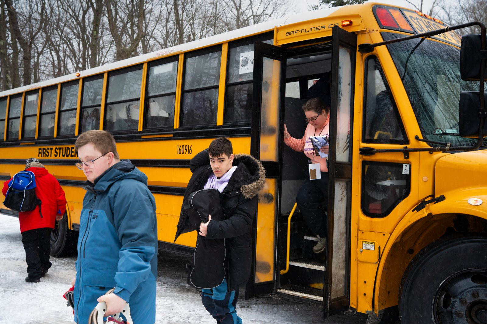 Athletes leave the bus before the cross country skiing competition at Bristol Mountain Nordic Center in Canandaigua. (Photo by Caleb Bennett)Volunteers Sue Michaels, Tim Walcyzk, and Abi Rahrle prepare the cross-country skiing competition at Bristol Mountain Nordic Center in Canandaigua, N.Y. (Photo by Caleb Bennett)
