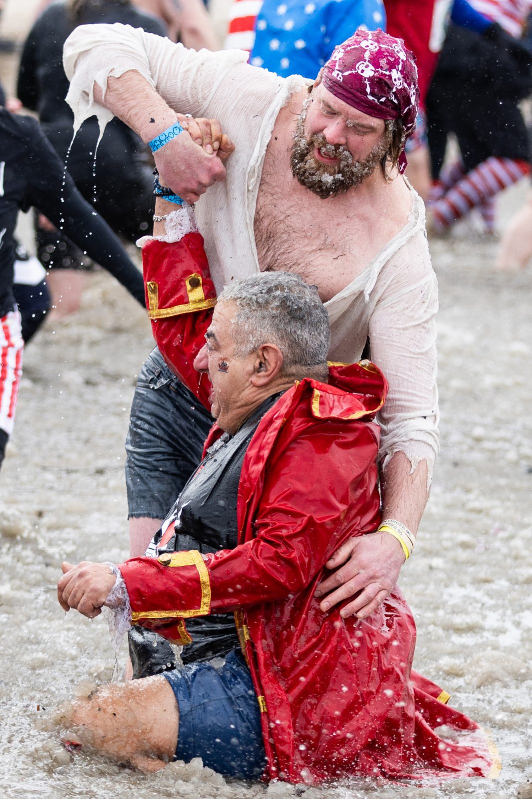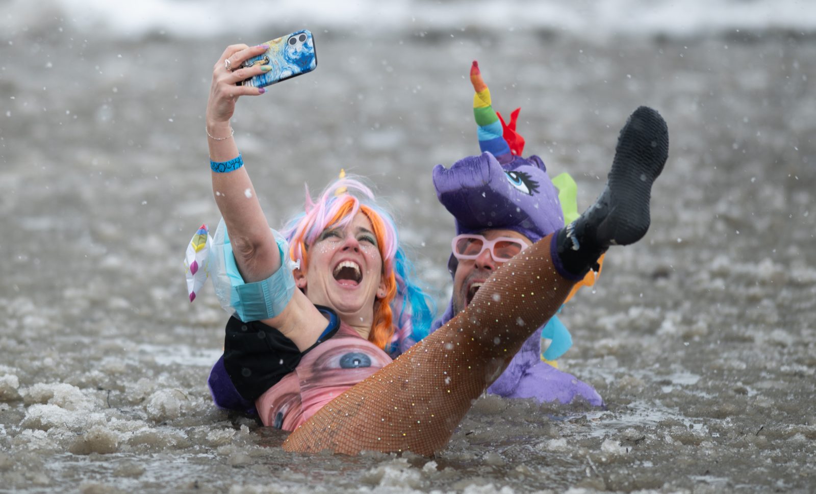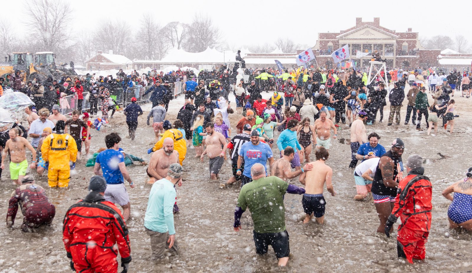 In the hours leading up to the plunge, the morning consisted of elaborate costumes, a tent party with dance music, and lots of excitement. From hotdogs and cowboys to swimsuits and underwear, the variety of outfits on the plungers were plentiful. A backdrop was set up for photos, a DJ was playing pop hits in the large tent attached to the main building, and the growing anticipation could be felt.