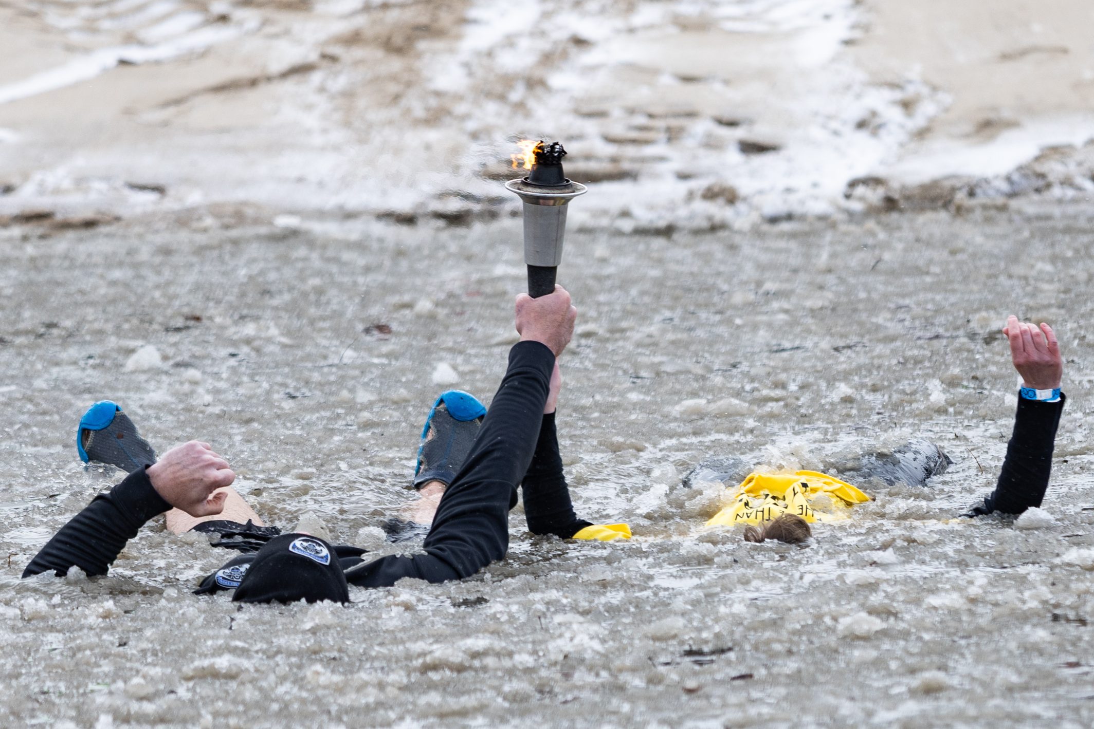 The plunge was headed by Emily Brushafer and Captain Sam Lucyshyn of the Rochester Police Department, who held the torch from the tent to the lake, smiling as they dipped into the freezing waters.